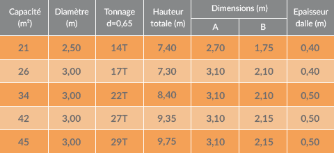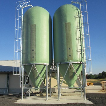 Silo monocoque de 21m3 à 45m3, châssis 4 pieds sur ceinture UPN avec croisillons de maintien, remplissage intégré, échelle de montée avec crinoline et échelle amovible.